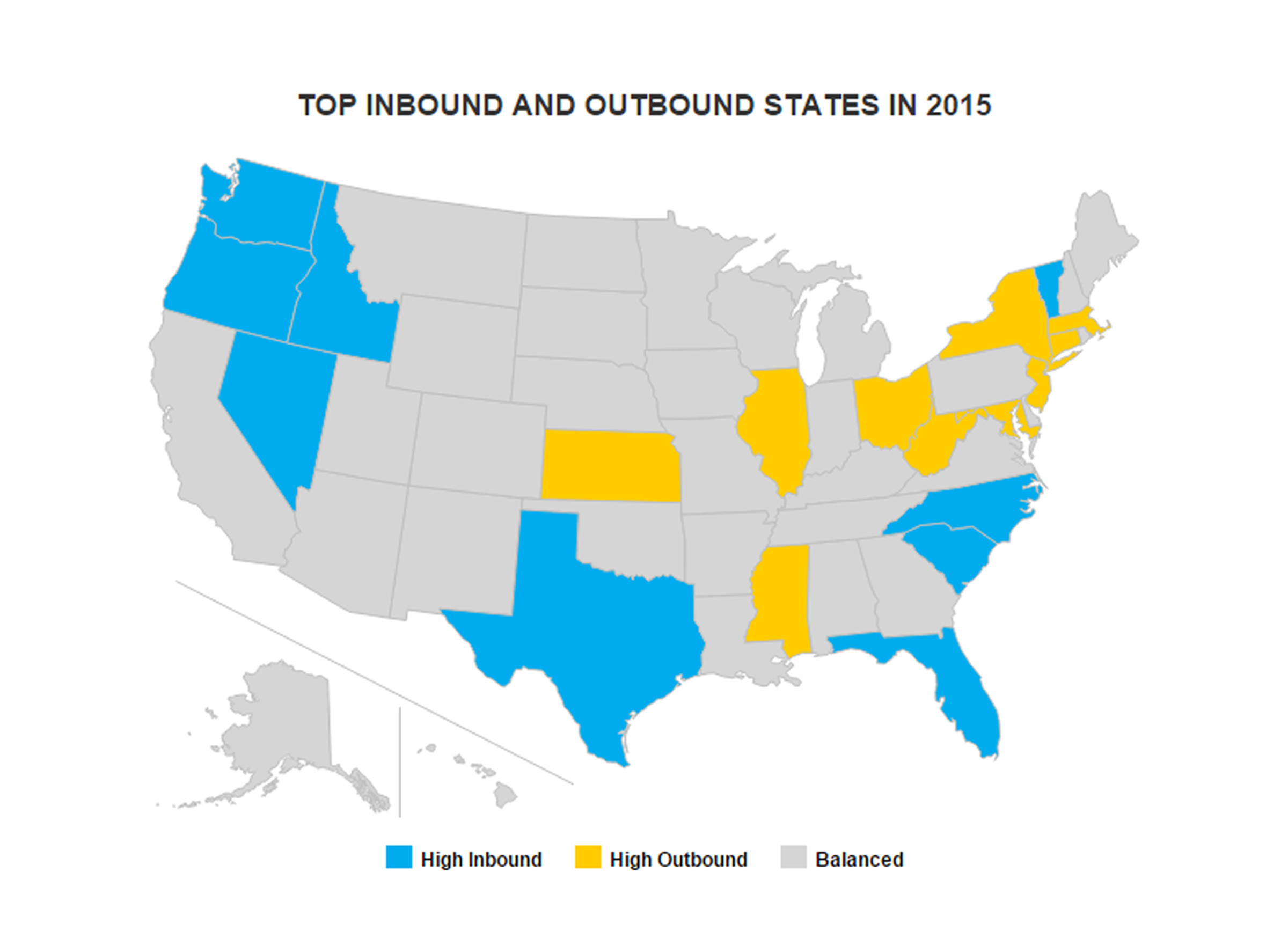 For the second time in a row, the state of Oregon ranked as the top move-in destination, with an inbound rate of 69%, up 3% from 2014. South Carolina and Vermont came in second and third, with inbound rates at 63% and 62%, respectively.